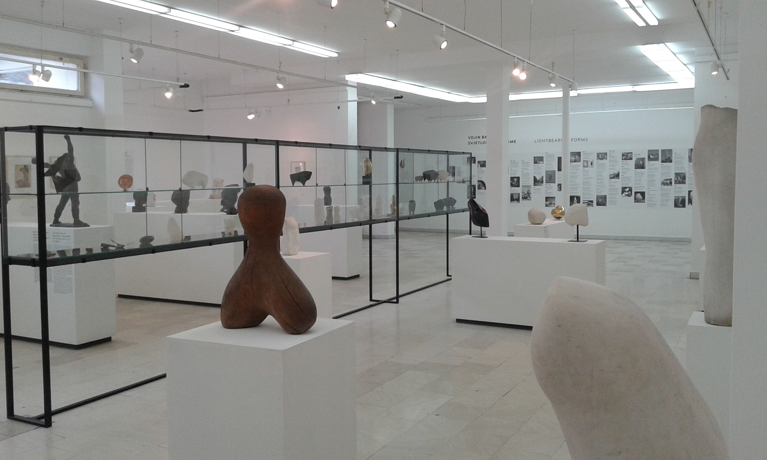 Veći eksponati postavljeni su na postamente namjenski izrađene za ovu retrospektivu, a manje studije i skulpture smještene su u staklenoj vitrini u središtu prostorije. Pomoćni izložbeni alati – legende, zalijepljeni su na svakom postamentu, odnosno ispod svake skulpture.
