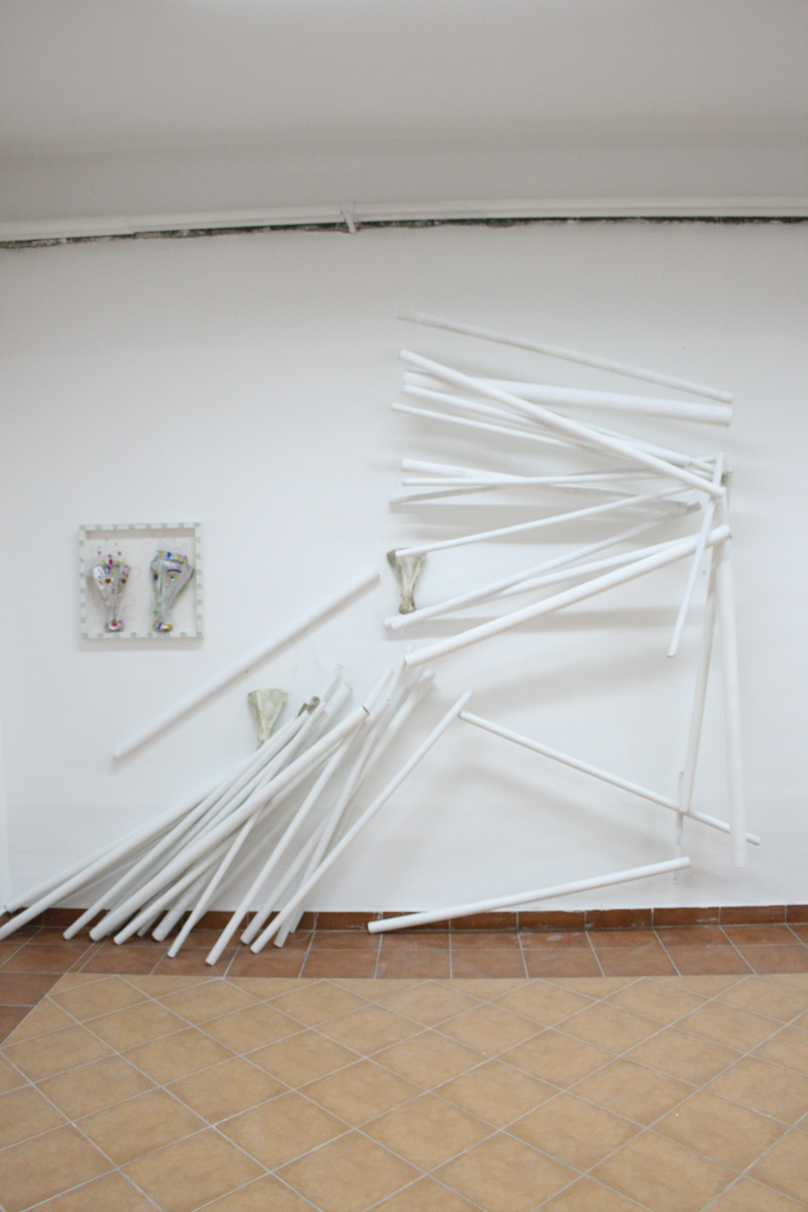U dijelovima instalacije ogranske oblike komponira kružno stvarajući zanimljive suodnose i aludirajući na ambijentalne vrijednost prisutne u prirodoslovnim muzejima.