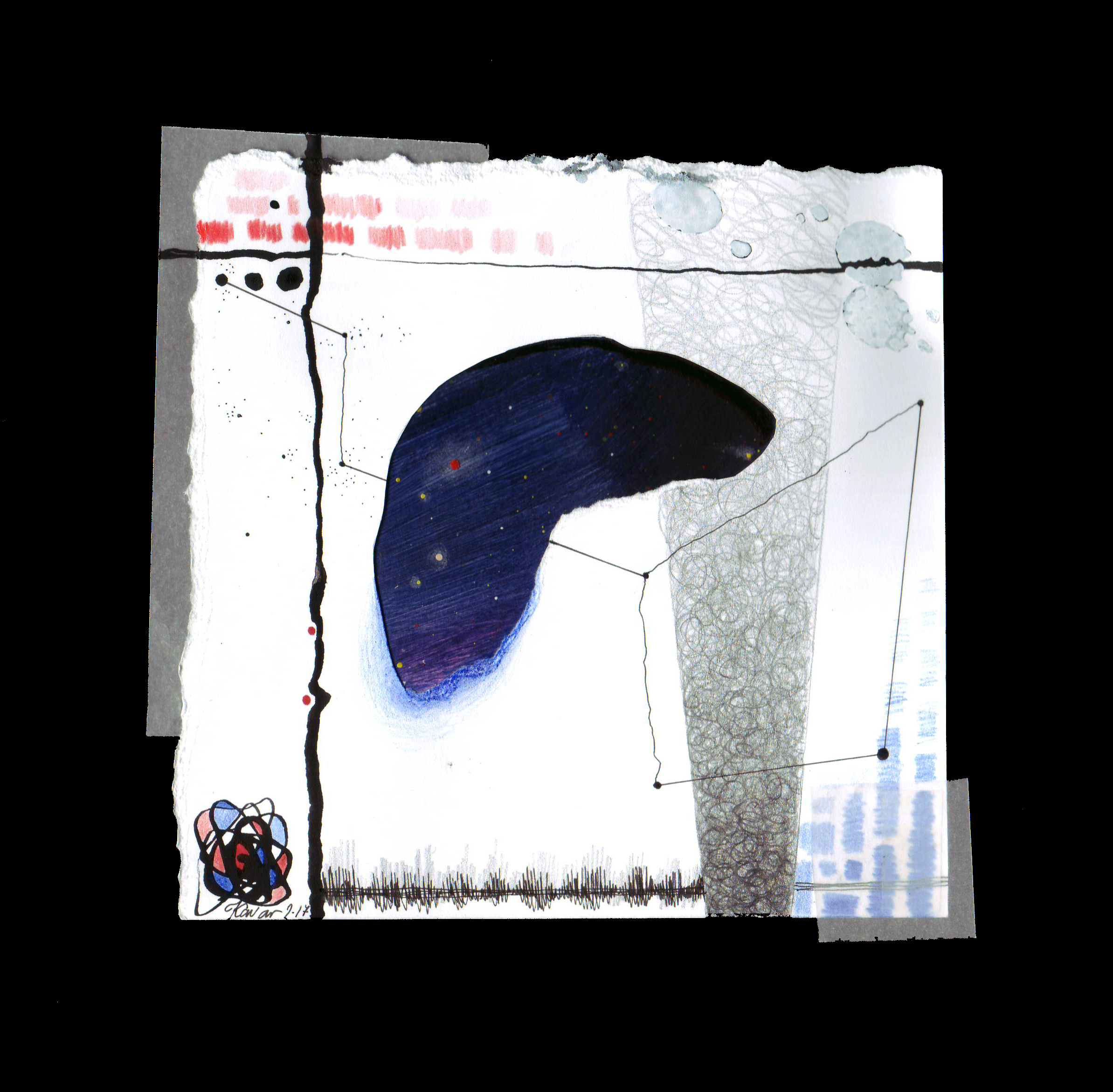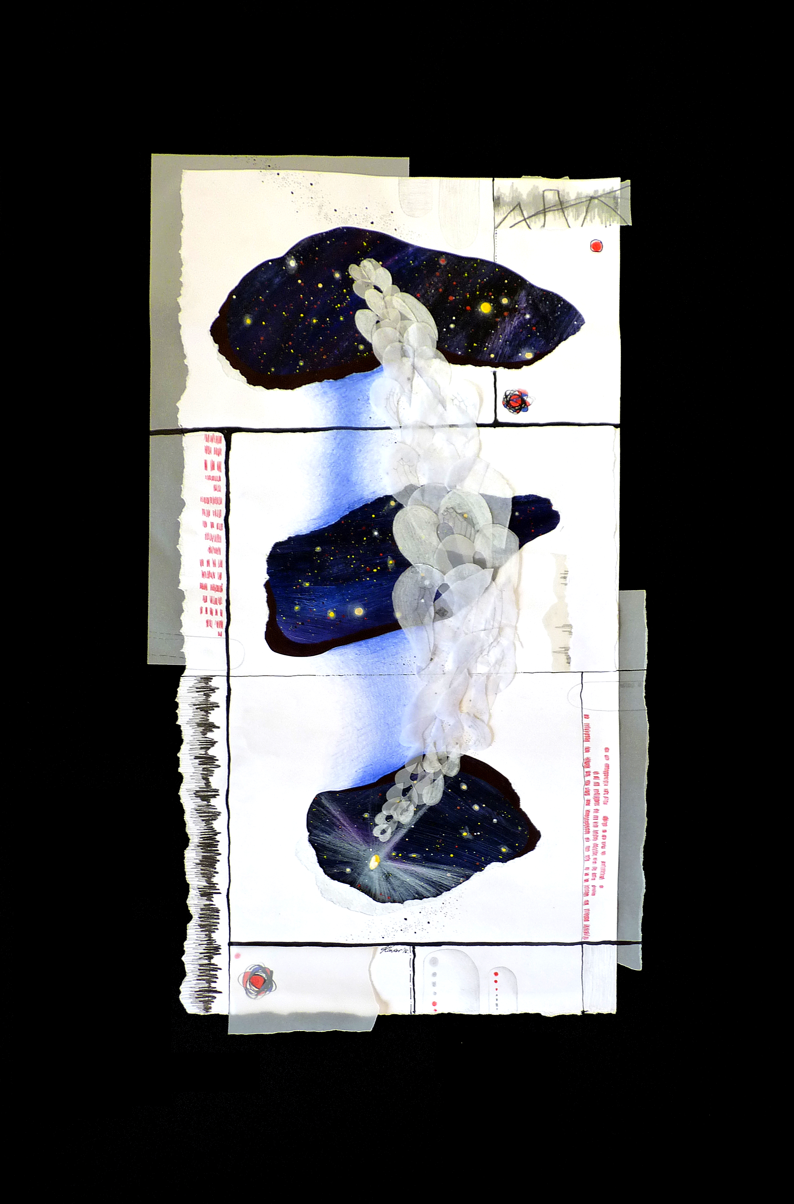 Budući da su prednje teksture ispunjene oblicima koji evociraju geometriju, atome, zvukove i čestice koje nas uvode u svijet kvantne fizike jasno je da su one odraz materijalne sfere i svega onoga što nam je vidljivo i dokazivo. Donje skrivene teksture, percipirane simbolički senzibilnim tijelima, donose sve ono daleko, neuhvatljivo i nerazumljivo kao što su crne rupe, sazviježđa, mijene, daleke galaksije… Zanimljivo je da svakim Kristininim djelom dominira nepravilna